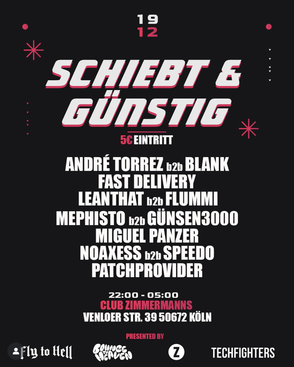 Club Zimmermanns Köln Venloer Str. 39, Köln, NRW, DeutschlandSCHIEBT UND GÜNSTIG! 🛒 🗓️ 19.12.25 🕙 22:00 - 05:00 Uhr 📍 Club Zimmermanns, Venloer Str. 39, 50672 Köln 💰 5€ Abendkasse, KEIN Vorverkauf! 💥Dein Knallerangebot der Woche! ➫ 11 DJ‘S / 7H RAVEN / Nur 5€ LINE - UP ANDRÉ TORREZ @andretorrez313 BLANK @blank.punkt FAST DELIVERY @fastdelivery_906 LEANTHAT @leanthat_official FLUMMI @sarahx01x MEPHISTO @mephistotechno GÜNSEN […]